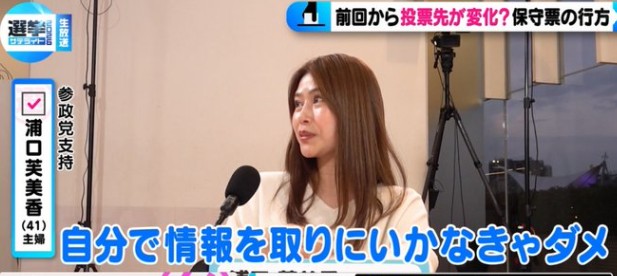 選挙特番「選挙サテライト2026」に登場した、参政党支持の41歳主婦・浦口芙美香(うらぐち・ふみか)さんが話題に。